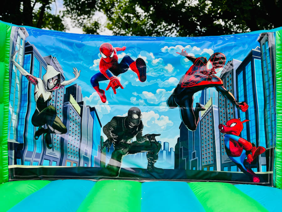 Swing into action with our Indoor Spider-Man: Into the Spider-Verse Bouncy Castle! Inspired by the hit movie, this inflatable features eye-popping graphics of beloved characters like Miles Morales, Peter Parker, and Gwen Stacy. With its dynamic design, bold colors, and comic-style details, it’s perfect for bringing the excitement of the Spider-Verse to life at your indoor event.