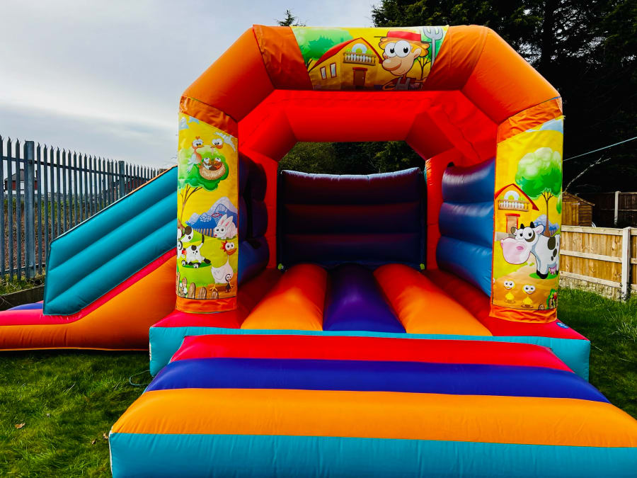 Welcome to the charming world of our Farmyard Side Slide & Bounce – where bouncing fun meets the rustic allure of the countryside! This delightful inflatable bouncy castle invites children to embark on a playful adventure amidst the rolling hills, friendly animals, and vibrant scenery of the farmyard.