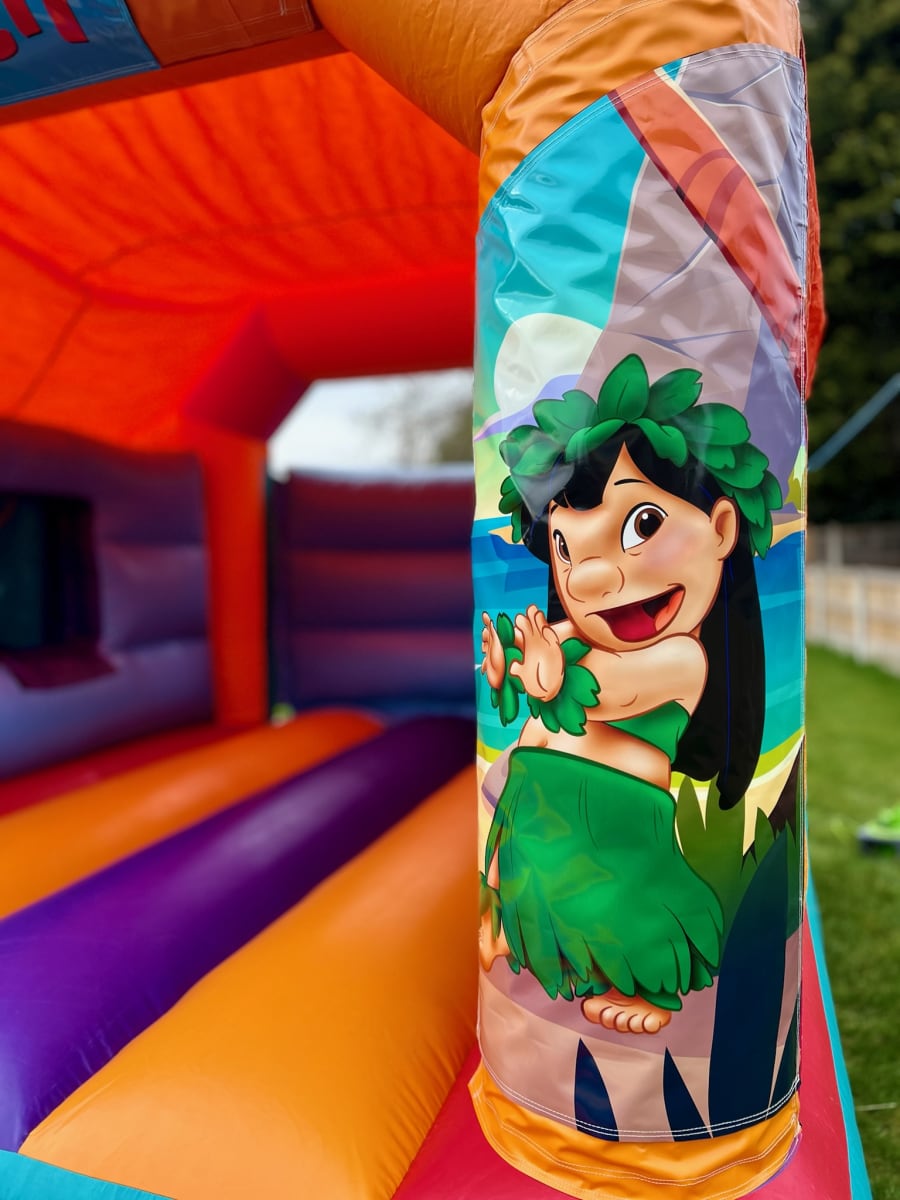 Step into the sunny beaches of Hawaii with captivating artwork featuring iconic scenes and characters from Lilo & Stitch. The immersive design transports children to the tropical paradise of the movie, where they can bounce, slide, and explore alongside their favourite characters.