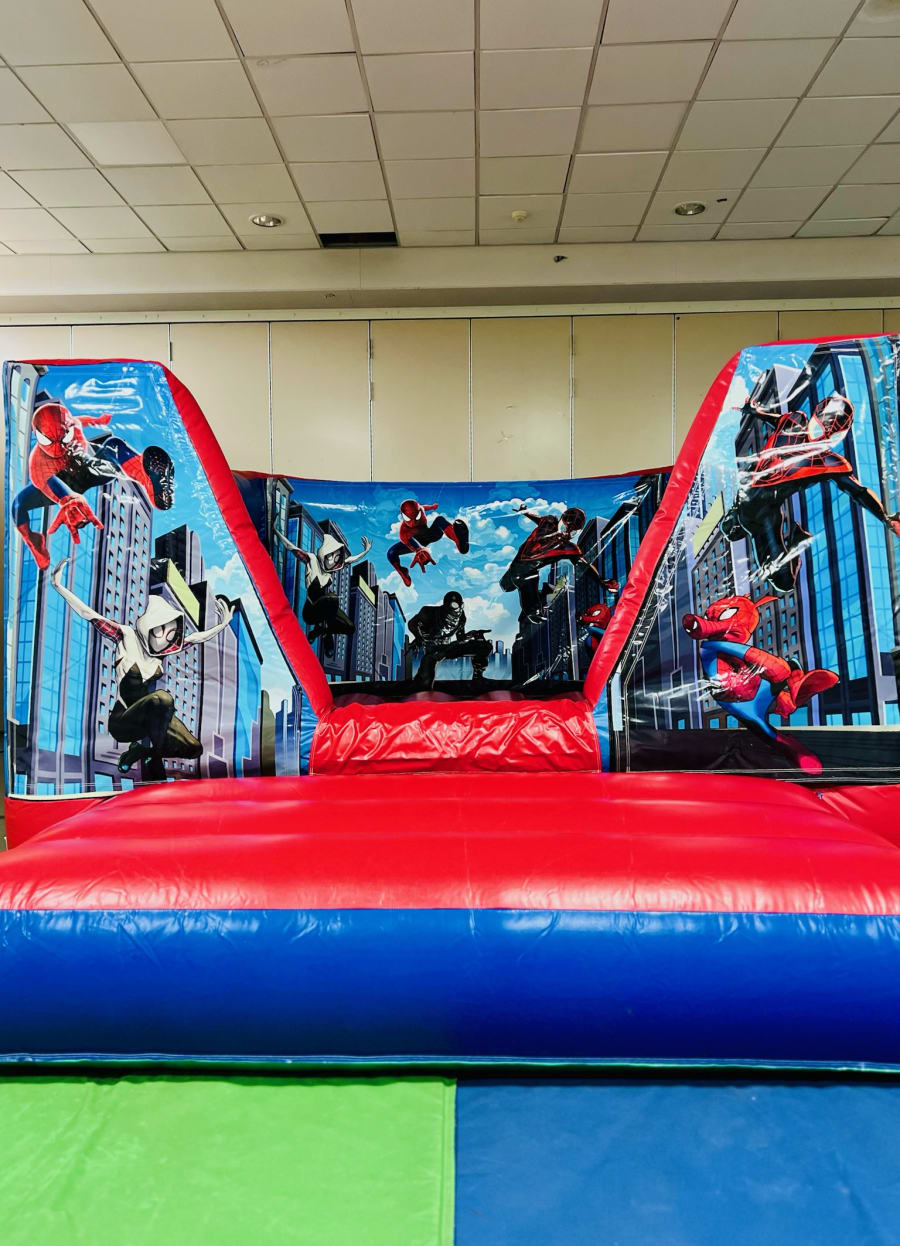 Swing into action with our Indoor Spider-Man: Into the Spider-Verse Bouncy Castle! Inspired by the hit movie, this inflatable features eye-popping graphics of beloved characters like Miles Morales, Peter Parker, and Gwen Stacy. With its dynamic design, bold colors, and comic-style details, it’s perfect for bringing the excitement of the Spider-Verse to life at your indoor event.