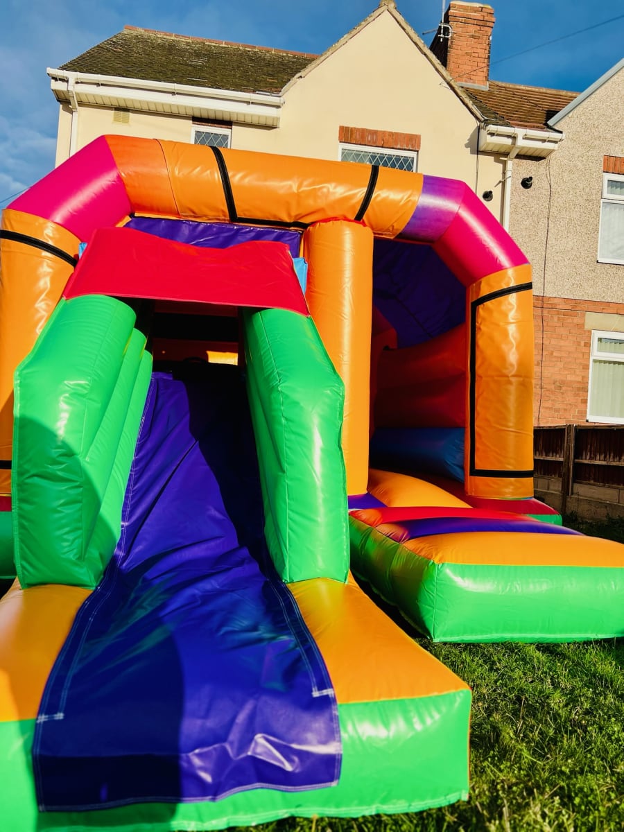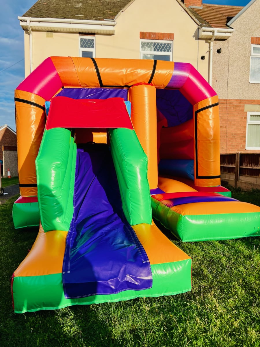 Ready to bring bright colours and big smiles to your event? Book our Plain Multi-Coloured Front Slide and Bounce Bouncy Castle today and let the fun begin!