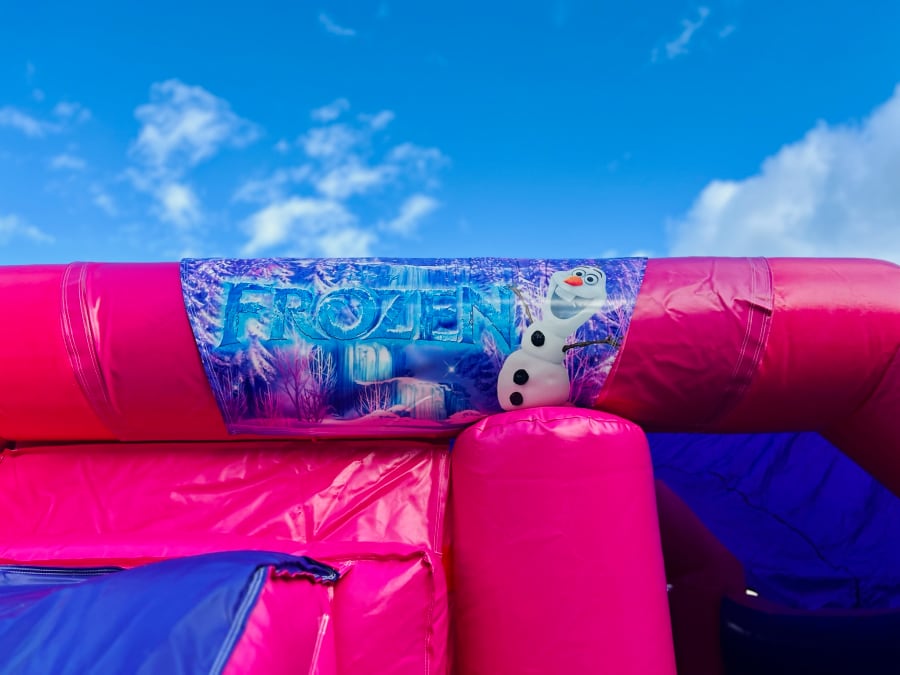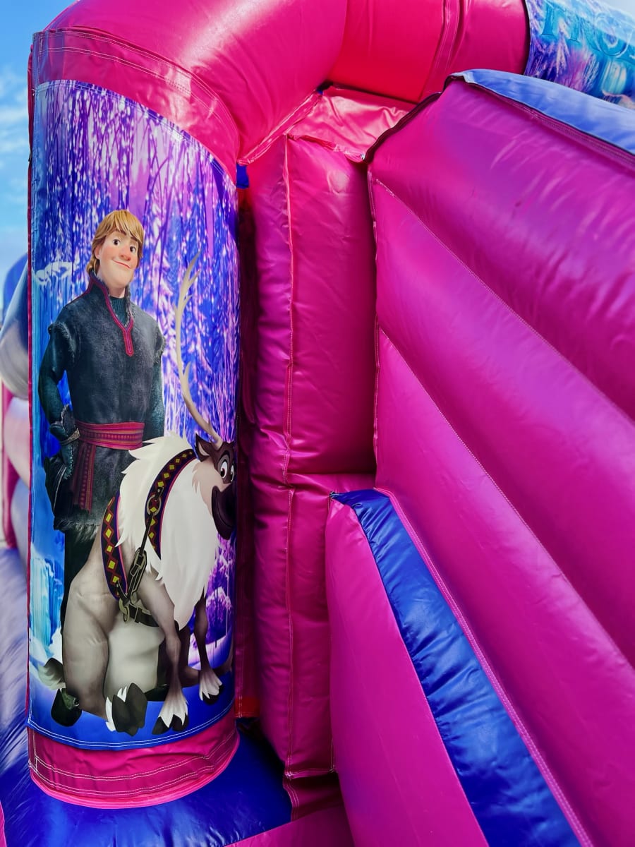 Available to hire in Doncaster, Sheffield, Rotherham, Barnsley, Worksop, Pontefract and nearby areas, this Frozen front slide and bounce castle is perfect for those looking for a premium Frozen bouncy castle hire in Doncaster and surrounding cities. Whether you’re hosting a princess party or a winter-themed celebration, this inflatable delivers unforgettable fun and magical memories.